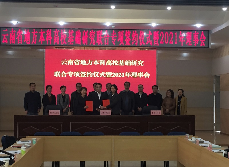 11月4日,云南省地方本科高校基础研究联合专项资金协议(第二期)签订仪式暨2021年理事会第一次会议在昆明举行。省科技厅厅长王学勤、二级巡视员王立新出席会议,开云kaiyun官方网站校长丁文丽、副校长马银海,楚雄师范学院校长王资等12家理事单位有关人员参加。会议由王立新主持。