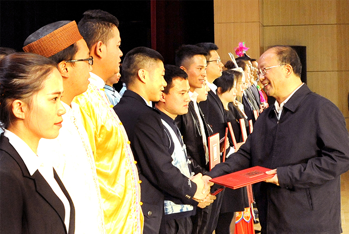 9月29日下午,云南省高校“新时代、新担当、新作为”主题活动在开云官网学生会堂举行。 省委常委,省委组织部部长,云南省大学生思想政治教育工作领导小组组长李小三出席活动并为年度人物获奖代表颁奖。 主题活动由主题班会展示、故事演讲、优秀人物颁奖等部分组成。云南师范大学辅导员赵德虎现场展示了一堂关于《学习党的十九大 争做时代新青年》的主题班会,通过“知•情•意•行”四个阶段,将党的十九大精神融入到学生头脑之中。全国高校辅导员年度人物、云南大学辅导员朱丹分享了自己担任辅导员6年来的成长历程,号召辅导员成为习近平总书记今年教师节寄语的塑造学生品格、品行、品味的“大先生”。云南大学学生傅靖涵讲述了云南大学研究生支教团的故事,充分展示了新时代青年乘新时代春风,在祖国的万里长空放飞青春梦想的风貌。整场活动寓意深厚、感人至深,引领广大师生爱国、励志、求真、力行。 主题活动对2018年云南省大学生年度人物、高校辅导员年度人物、最受学生敬佩辅导员、最关爱学生班主任进行表彰。省委常委,省委组织部部长,云南省大学生思想政治教育工作领导小组组长李小三出席活动并为云南省第十届高校辅导员年度人物和第十三届大学年度人物获奖代表颁奖。云南省人民政府教学督导团总督学陈世波为云南省高校第四届最受学生敬佩辅导员和第三届最关爱学生班主任获奖代表颁奖。 活动最后,开云官网全体辅导员齐唱《辅导员之歌》,唱响育人的路上高举理想,用爱与智慧为青春导航。