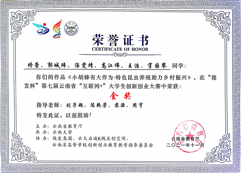 2019级资源利用与植物保护硕士研究生佟蕾在导师的带领下,积极深入云南胡蜂主要养殖地区走访调研,了解到蜂王的越冬已经成为制约胡蜂人工养殖行业的关键技术问题。师生共同组成胡蜂人工养殖技术研发团队。经过对人工养殖条件下胡蜂发育、筑巢、病害等生物学特性进行了系统研究,研发了胡蜂人工反季节养殖、三级蜂箱控蛹养殖和智能圈养养殖方法,可使蜂蛹产品周期增加2个月,产品单价提升20%。通过推广带动300余户增收150万元,让胡蜂规模化生产成为可能。本项研究先后获得中国研究生乡村振兴科技强农+创新大赛苏研杯第三届科技作品竞赛一等奖;第七届中国国际互联网+大学生创新创业大赛国家级铜奖、云南赛区红旅赛道金奖;第六届创客中国云南省中小企业创新创业大赛创客组二等奖且入围全国500强。