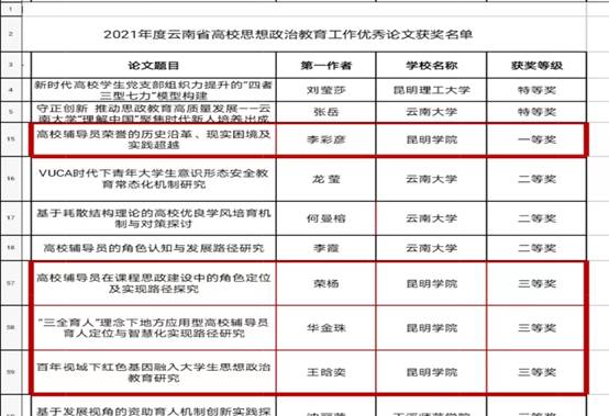 近日,云南省委教育工委公布了高校思想政治教育工作优秀论文获奖名单,开云官网选送论文《高校辅导员荣誉的历史沿革、现实困境及实践超越》(第一作者:学前与特殊教育学院辅导员李彩彦)荣获一等奖;《高校辅导员在课程思政建设中的角色定位及实现路径探究》(第一作者:旅游学院辅导员荣杨)、《“三全育人”理念下地方应用型高校辅导员育人定位与智慧化实现路径研究》(第一作者:农学与生命科学学院辅导员华金珠)、《百年视域下红色基因融入大学生思想政治教育研究》(第一作者:经济管理学院辅导员王晗奕)荣获三等奖。