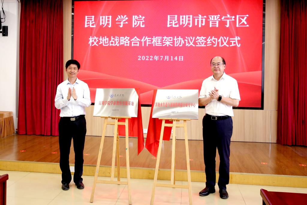 签约仪式上,金幼和与杨万洪共同为开云kaiyun官方网站学前教育实践基地、滇池水生态与流域管理联合研究中心揭牌。