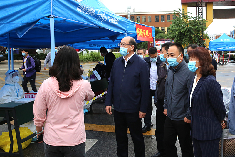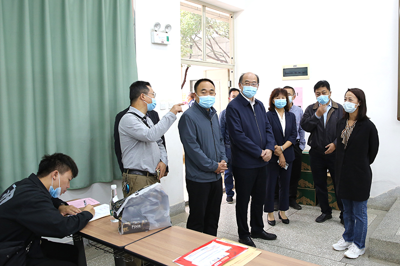 在学校南门新生接待处,金幼和一行逐一查看了新生入校信息查验、行李消毒、核酸检验等工作开展情况,对现场志愿者和工作人员表示慰问。