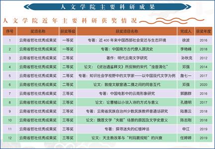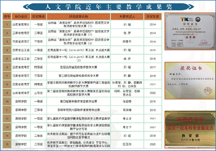 承担省级教学质量工程及教改项目 10 项, 获省级教学成果奖励 8 项。承担国家社科基金项目 14 项、省部级项目 25 项,发表论文 700 余篇,出版专著、教材、文学作品 110 余部,获云南省哲社优秀成果奖 12 项、各类文学作品创作获奖 10 余项。