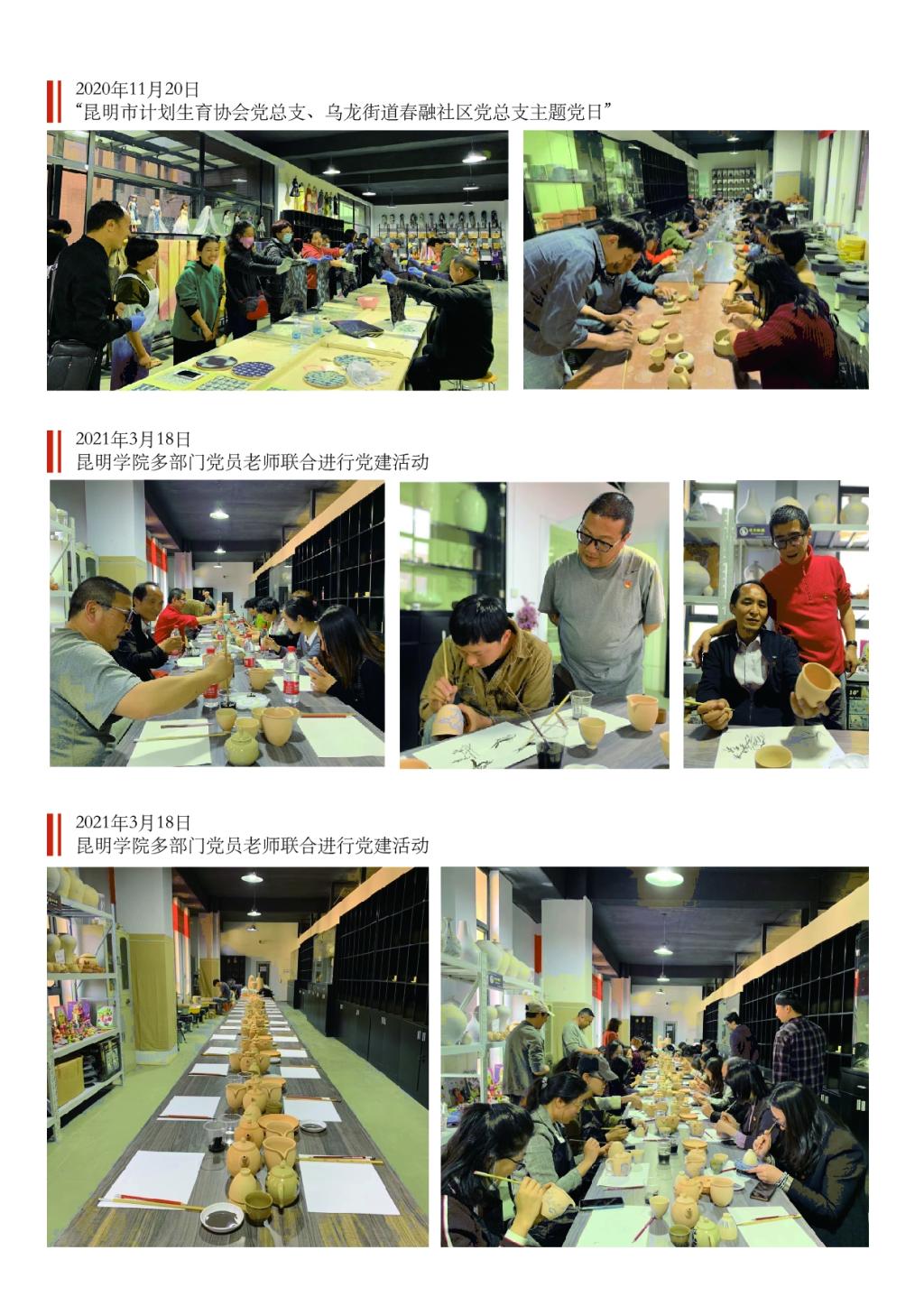 通过“紫云青鸟党建共建平台”,定期开展形式多样的特色党建活动,通过党建活动促发展、增团结、添活力,激发双创平台互利合作、资源共享的孵化功能,同时打造系列可感、可触的文化活动,展现出学院的特色与风采。“艺传薪火,创意听心”创意集市整合学院优秀创意资源,实现学生由创意—作品—产品—商品的创新实践过程,成为学校文化传承与创新发展的一张名片。结合党史学习教育,实施“六个100”工程 :与经开区“两新党委”打造100个主题党日活动、与南京大学共同在云南省美术馆举办“百年听心”百件美术作品展、制作“中国共产党百年重要党史MG动画”100集、编绘《中国共产党重要党史100集少儿手绘本》、汇编《100个党史重要素描人物作品集》、设计“100个中国共产党精神家园招贴”。在互联网+大赛和创新创业大赛中,获金奖1项、银奖2项、铜奖6项,其中“波澜壮阔百年征程——中国共产党百年重要党史MG动画”项目获云南省第七届互联网+创新创业大赛银奖、云南省创新创业大赛优秀奖等6项成果。