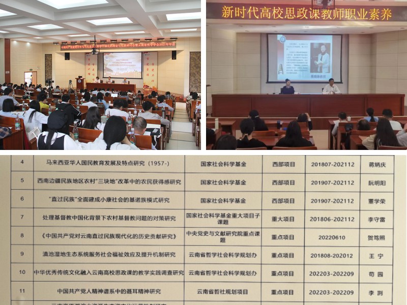 学院按照“学科交融、专业交叉、特色突出、争创一流”的专业建设思路,积极更新专业建设理念,强化专业内涵建设,增强专业特色优势。2021年获批云南省马克思主义理论一级学科硕士点立项建设;思想政治教育专业2021年获批国家“双万”计划云南省一流本科专业建设点,专业综合评价为C+。加大课程改革力度,努力打造一流本科课程,2021年《读懂云南:铸牢中华民族共同体意识的高校思政课育人模式创新与实践》获批云南省高等教育教学成果培育项目立项,2022年1门课程获云南省研究生优质课程立项、3门课程获校级一流课程立项、2门课程获校级课程思政项目立项。3门本科生思政课程获校级一流课程建设立项,1门研究生思政课程获省级优质课程建设立项、1门获校级优质课程建设立项,获省级特色研究生教学案例库项目立项1个。教师科研成果丰硕,出版学术专著22部,在CSSCI等学术期刊发表论文220篇;主持国家社科基金10项,省哲社课题22项,获省哲社优秀成果奖5项;各级各类科研经费582.25万元,承担省、市、县(区)政府部门和相关企事业单位课题26项,研究成果被省市政府采纳12项,成果社会转化效益突出。