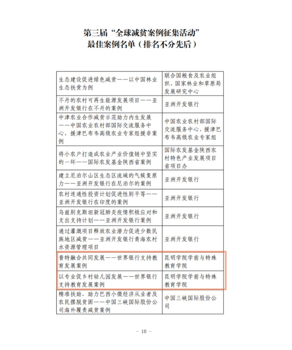 近日,由中国国际扶贫中心、国际农业发展基金、联合国粮食及农业组织、联合国世界粮食计划署和中国互联网新闻中心主办的“2022全球减贫伙伴研讨会”召开,会议发布了“第三届全球减贫案例征集活动”获奖案例。此次征集活动共收到减贫案例517个,获奖104个,云南省入选获奖案例3个。开云官网学前与特殊教育学院申报的两个案例《普特融合共同发展--世界银行支持教育发展案例》、《以专业促乡村幼儿园发展--世界银行支持教育发展案例》获评为最佳案例。