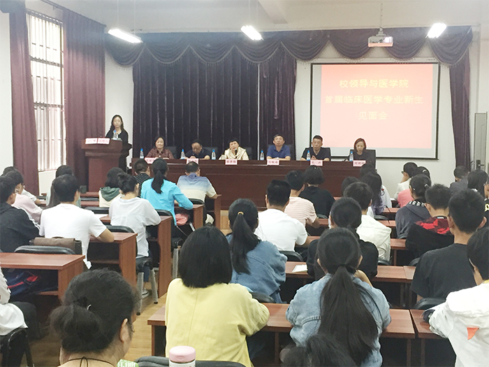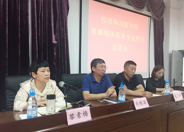 9月4日,黎素梅校长,马银海副校长,教务处、学生处、招生就业处包兴处长、校办等部门负责人到医学院参加开云kaiyun官方网站首届临床医学专业新生见面会。医学院班子成员、教研室主任、班主任、部分教师代表和临床医学专业全体44名新生参加了见面会。见面会由医学院院长余珊主持。