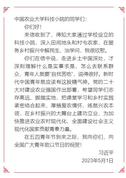 中共中央总书记、国家主席、中央军委主席习近平近日给中国农业大学科技小院的同学们回信,提出殷切期望,并在五四青年节到来之际,向全国广大青年致以节日的祝贺。