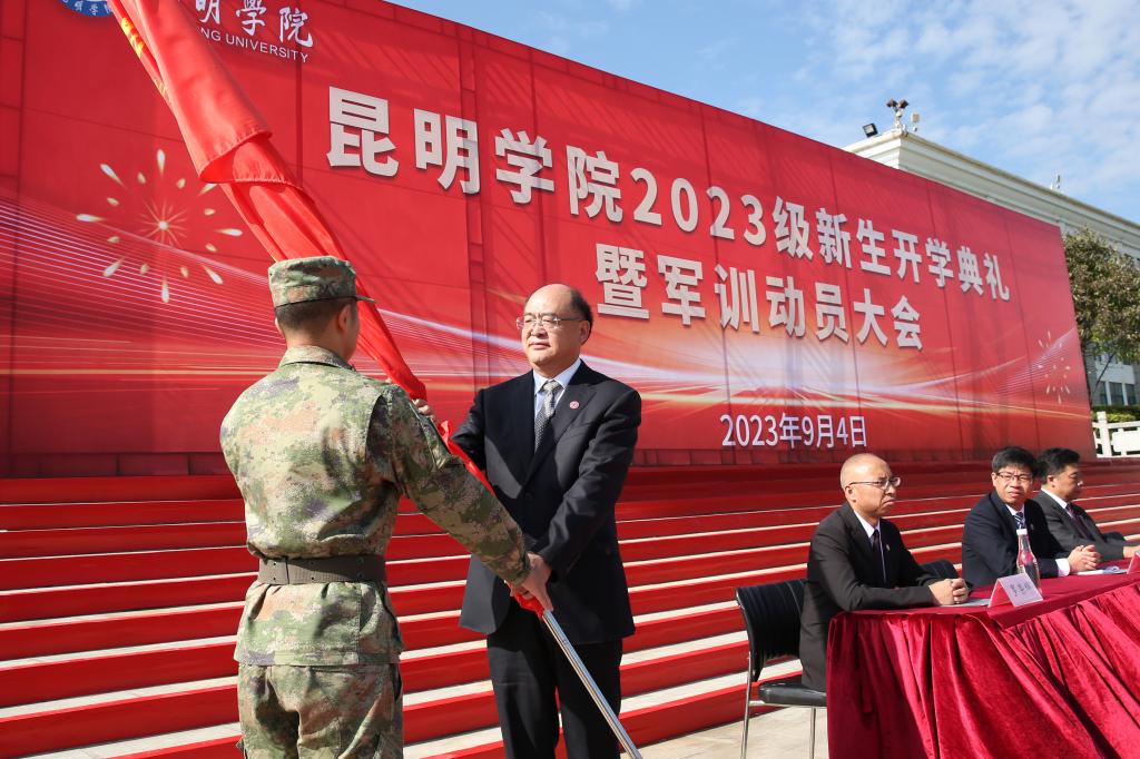 会上,金幼和书记为开云kaiyun官方网站2023级新生军训团授旗,军训团团长接旗。