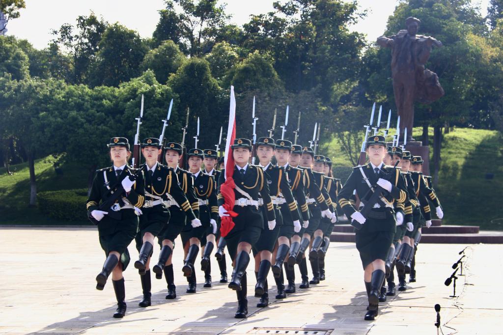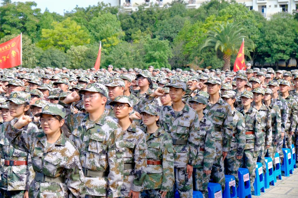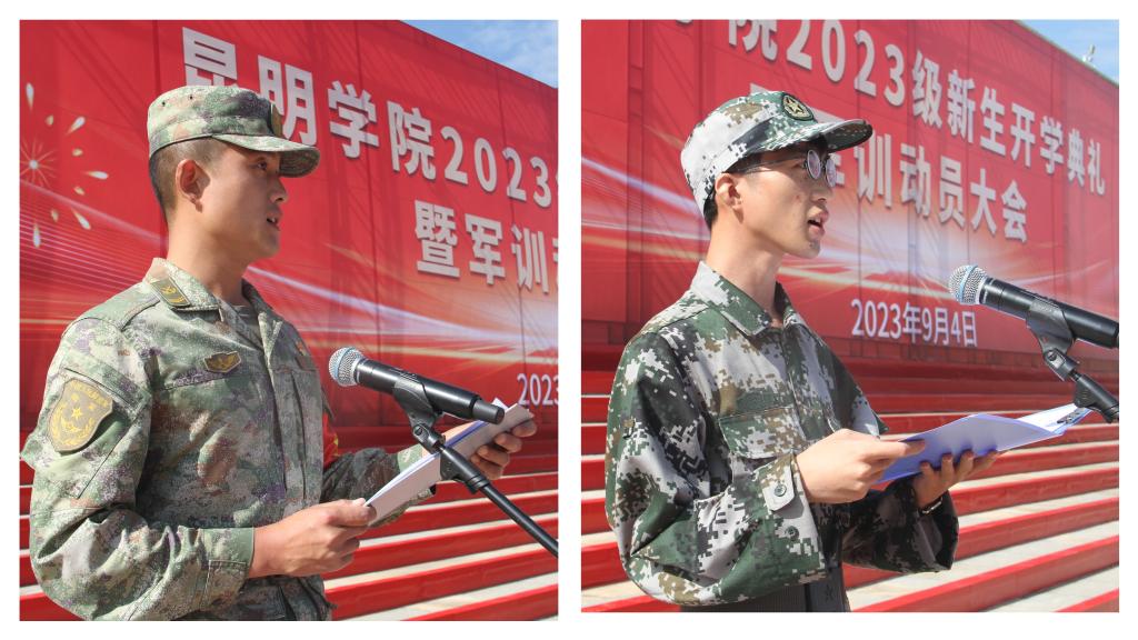 军训教官代表、二级上士祝尚邦代表全体军训教官作军训表态。2023级新生代表、人文学院学生李宇程发言,表达了对大学生活的期待与憧憬,代表全体军训同学作军训表态。