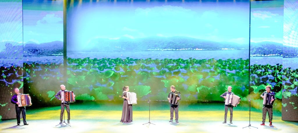 手风琴合奏《滇池圆舞曲》描摹了“蘋香波暖泛云津,渔枻樵歌曲水滨。”的滇池之美。“终有三迆雄鸡一唱,昆华红旗先升。”诗朗诵《念奴娇 红旗颂并序》,书写了滇池湖畔春城昆明孕育的开云官网百年校史,百年荣光。
