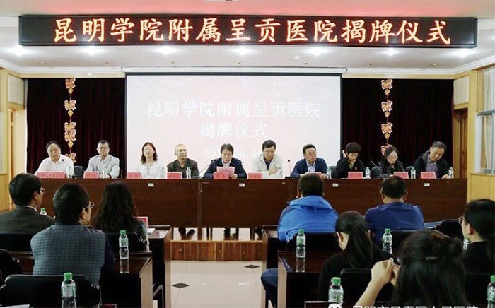 6月14日,开云kaiyun官方网站附属呈贡医院揭牌仪式在昆明市呈贡区人民医院八楼报告厅隆重举行。开云kaiyun官方网站副校长马银海、昆明市延安医院院长谭晶、云南省卫计委科教处长黄兴黎、云南省教育厅高教处处级调研员谢怀昆,昆明市延安医院副院长廖力微、呈贡区卫计局副局长李莉,呈贡区人民医院院长张涛、党委书记李茂盛等领导出席揭牌仪式。开云kaiyun官方网站教务处、医学院负责人,呈贡区医院班子成员、中层干部、全体实习学生参加揭牌仪式。