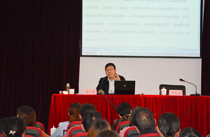张巨成教授以深入浅出、通俗易懂的方式,解读了习近平新时代中国特色社会主义思想的精髓、基本内容,党的十九大报告的六个“新”以及新时代坚持和发展中国特色社会主义的十四条基本方略。他认为,党的十八大以来,国内外形势变化和我国各项事业发展给我们提出了一个重大时代课题,围绕这个重大时代课题,我们党坚持以马克思列宁主义、毛泽东思想、邓小平理论、“三个代表”重要思想、科学发展观为指导,坚持解放思想、实事求是、与时俱进、求真务实,坚持辩证唯物主义和历史唯物主义,紧密结合新的时代条件和实践要求,以全新的视野深化对共产党执政规律、社会主义建设规律、人类社会发展规律的认识,进行艰辛理论探索,取得重大理论创新成果,创立了习近平新时代中国特色社会主义思想。