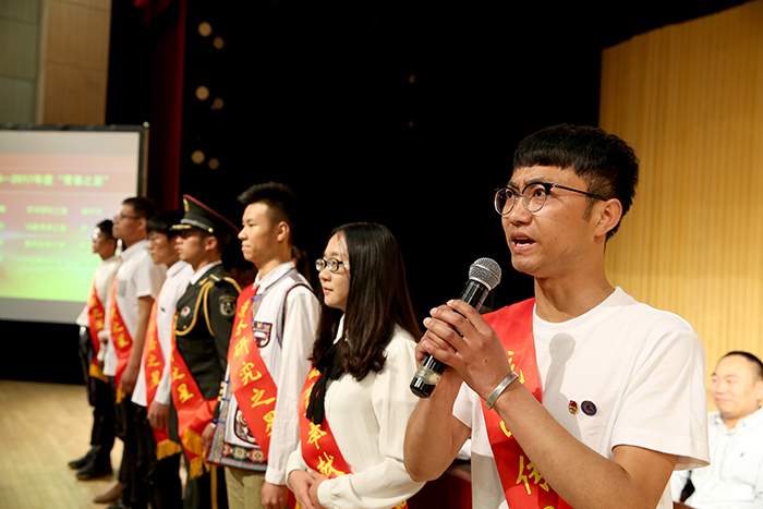团员代表、专业技能之星王嘉曦同学发言。从专业学习、社会实践、创业创新等方面,分享了自己的学习成长经历。讲述了他在校期间美术作品获得国家级奖项8次、省级和校级奖项19次、留校收藏作品10幅,荣获了第十二届云南省大学生年度人物、连续三年获开云kaiyun官方网站三好学生、2015年获得中国美术学院社会美术水平考试山水8级证书、2017年获国家奖学金等12项荣誉称号。同时他在大一学年就举办美术作品联展,四年来坚持手绘开云kaiyun官方网站每一处风景的明信片,运用创新创业实践与同学共同开了淘宝店。他用自己的经历告诉我们要珍惜青春、努力学习、回报父母、奉献社会。