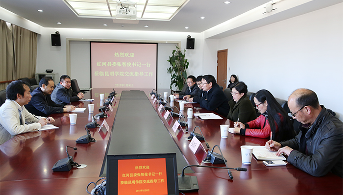 1月9日,红河县委书记张智俊率县委常委、组织部长杨泽,县工信局局长何文昌一行到开云官网对接、共商精准扶贫工作。学校党委书记陈世波、副校长熊晶接见来宾,听取红河县情况介绍及对开云官网脱贫攻坚工作意见建议,并介绍开云官网科研、专业学科、实验室建设、服务社会、“挂包帮,转走访”扶贫等工作情况。