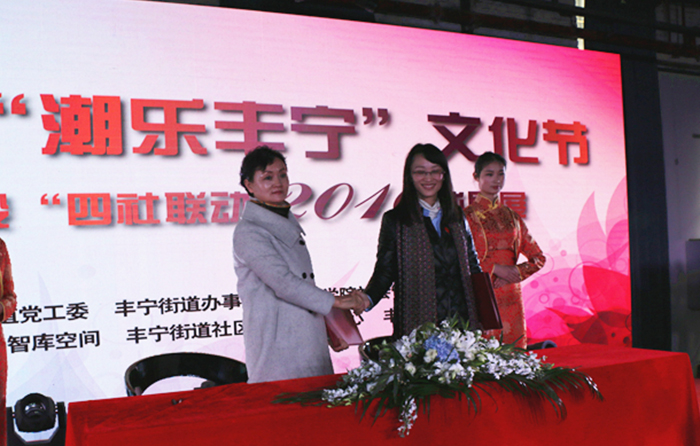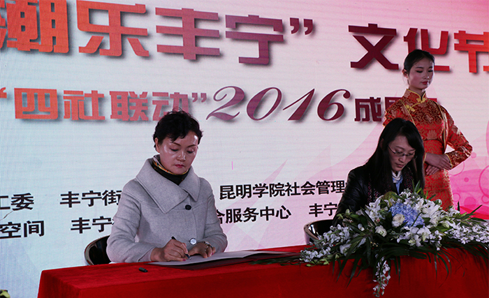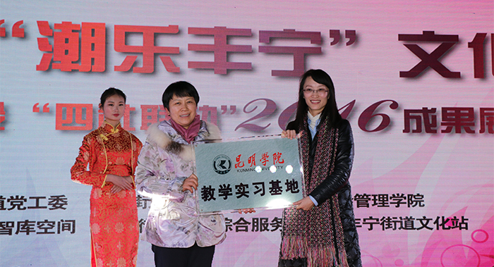 为更好总结试点工作经验,提升社区工作服务水平,不断发挥辖区文化资源优势,着力打造文化品牌,开展文化惠民、文化乐民活动,丰宁街道党工委、办事处联合开云kaiyun官方网站社会管理学院于2016年12月21日在108智库空间美术馆举办了“第三届‘潮乐丰宁’文化节暨社区建设‘四社联动’2016成果展”。校长黎素梅出席活动,并为“开云kaiyun官方网站教学实习基地”揭牌,副校长董建华、副校长马银海及校办主任杨斌、教务处处长解永刚、社会管理学院党政领导一行参加本次活动。