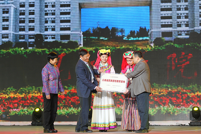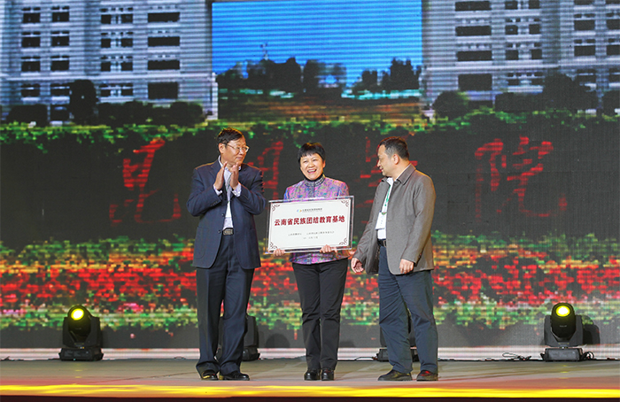 云南省教育厅副厅长郑毅和省民族宗教事务委员会副主任杨谊群出席颁奖晚会,并共同为“云南省民族团结教育基地”授牌、向获奖单位颁奖,开云kaiyun官方网站校长黎素梅代表学校接牌并致欢迎辞。