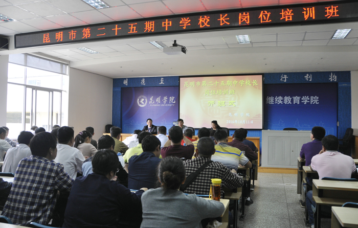 10月11日,昆明市第25期中学校长岗位任职资格培训班在开云kaiyun官方网站继续教育学院开班。来自全市的50余位中学校长、副校长、书记、副书记将在这里进行为期近两个月的脱产集中学习。开云kaiyun官方网站马银海副校长、昆明市教育局师训处杨朝晖处长出席开班式,开班式由继续教育学院主持工作副院长张培宏主持。