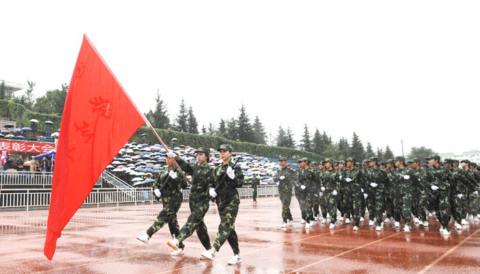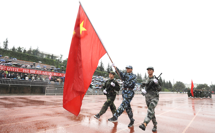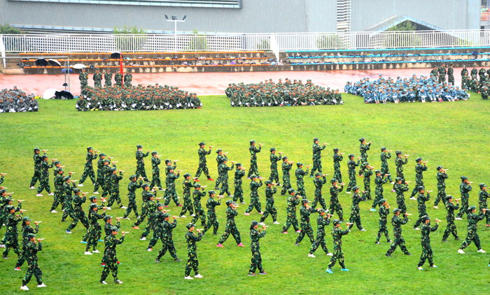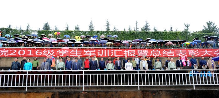 汇报演出伴随着连绵的阴雨在掌声和欢呼声中结束。虽然天公不作美,但全程没有一位受训同学放弃退出,也没有一位观礼师生中途退场。现场热烈的掌声是对同学们军训成果的充分肯定与褒奖,也是对全校师生员工昂扬的精神和坚强的作风的充分肯定与褒奖。