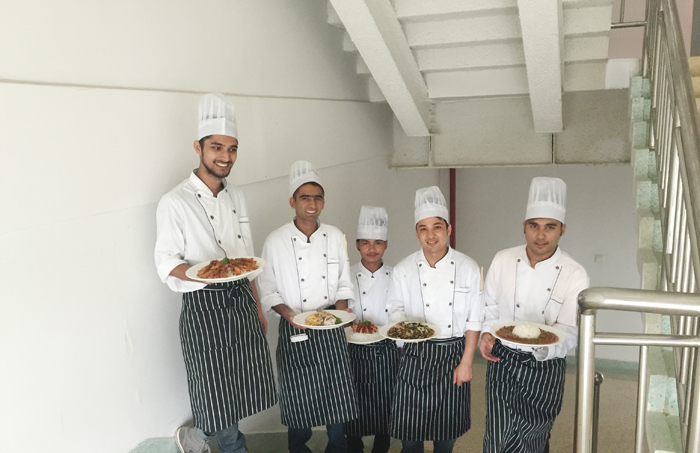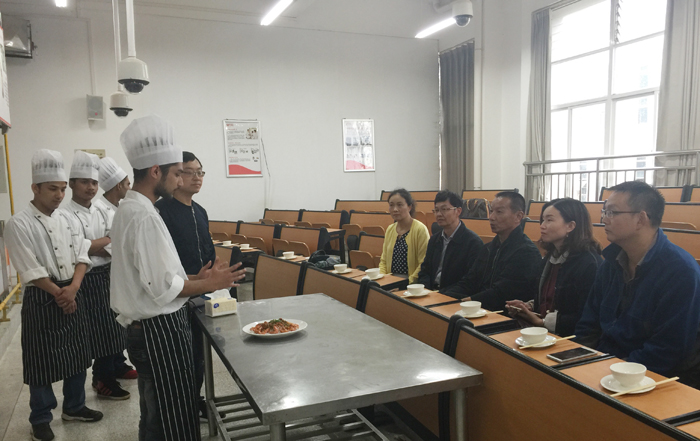 毕业典礼开始,由尼泊尔同学制作并展示自己的拿手菜,并向各位领导及老师介绍每道菜的原料,做法及味型,由在场的领导和老师品鉴并进行点评。