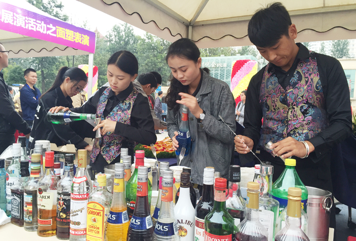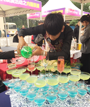 本着践行与创新的活动主题理念,旅游学院酒水小分队20余名同学,在田芙蓉院长与实验室主任龚捷老师的指导下参加了开幕活动。伴随花式调酒表演及烹饪专业、酒店管理专业学生对展台的精美布置与设计,代表队调酒30余款。