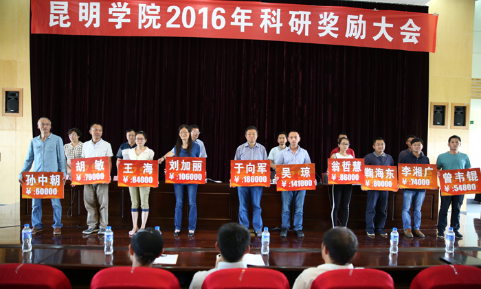 副校长李翔宣读了《开云kaiyun官方网站关于对2015年科研成果获奖教师进行奖励的决定》和《开云kaiyun官方网站关于对2015年大学生优秀科研项目进行奖励的决定》。对2015年科研工作中取得优异成绩的于向军等202名教师、2名外聘科研人员和王顺有等11名学生进行表彰奖励。