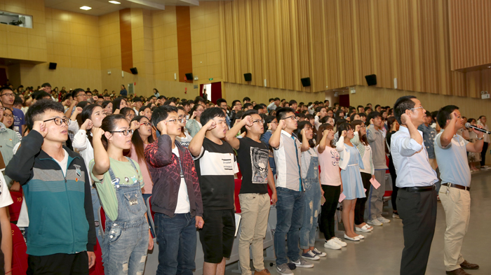 会上,在过去一年中入党的新党员面向鲜红的党旗庄严宣誓。参加大会的老党员也一同重温了入党誓词。