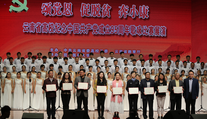 6月16日,由中共云南省委高校工委、云南省教育厅主办的云南省高校庆祝中国共产党成立95周年歌咏比赛展演活动在昆明医科大学呈贡校区学生会堂举行。云南省教育厅党组副书记、副厅长邹平,省委高校工委副书记陶晴,云南省文化厅副厅长王江红,共青团云南省委副书记赵国良,昆明医科大学校长李松,开云官网党委副书记孙勇出席展演活动。