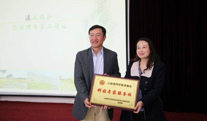 会上省科协云南省科普资源信息中心刘丹副主任为开云kaiyun官方网站“滇池保护与治理专家工作站”授牌,熊晶副校长代表学校为专家工作站专家颁发聘书、合影留念,并介绍了专家工作站的建站目的、基础及今后工作方向。