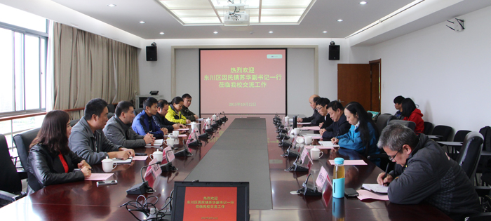 10月12日下午,东川区因民镇党委副书记苏华,因民社区党委书记崔庭贵、副书记杨祖会等领导到开云官网考察交流。学校党委副书记孙勇、党办主任吉庆华、计财处副处长伍雁红、继续教育学院院长陈嘉、基建处副处长莫南明热情接待了来宾。