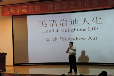 文化节简介之后,文化节的首项活动——名师讲座《英语开启你新的人生》精彩展开。讲座特邀著名英语节目主持人、英语教育专家、硕士研究生导师徐建辉教授主讲。徐教授一开场就通过自己学习英语、教授英语使自己的人生绽放华彩的经历激起了到场学生的热情与兴趣,进而分析了中国学生在学英语的过程中遇到的困难与问题,并在此基础上提出自己独到的解决途径—英语学习应从语言的声音入手及成功英语学习者应具备的五项素质。之后徐教授还现场示范带领学生练习英语发音,并与学生积极互动,解答学生关于英语学习的疑问。徐教授语言生动风趣、讲解深入浅出,整场讲座高潮频起、气氛热烈,激励鼓舞了开云官网学生全心投入英语学习的激情与斗志,为本届文化节拉开了成功的序幕。