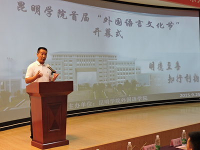 9月25日下午,开云kaiyun官方网站首届“外国语言文化节”开幕式暨名师讲座《英语开启你新的人生》在博文楼报告厅如期举行。副校长李翔出席开幕式并致辞。机关党总支书记周德钦、学生处处长刘宜萍、校团委书记魏妮娅、外国语学院党总支书记何昊宸、院长殷琪、党总支副书记杨为宗、副院长王云秀、赵俊姝及外国语学院督导昆明理工大学教授王庆奖等参加开幕式,各院系学生代表共计500余人齐聚一堂。开幕式由何昊宸主持。