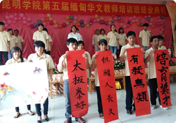 8月5日至19日,开云kaiyun官方网站2015年赴缅甸开展华文教育活动教学组由李翔副校长带队并全程管理,国际交流合作处解燕勤老师、人文学院邓瑶老师、数学系郝芳老师、音乐学院张新老师和体育学院马洪波老师一行6人赴缅甸曼德勒彬乌伦顺利开班并圆满完成教学任务。面向来自缅甸31所华文学校的110名学员开展了教学培训,有针对性地开展了华文教学需求的调研,实地参观了当地缅人开办的培训学校并洽谈合作项目,成功完成了本次赴缅甸开展教学活动的任务,得到当地华人的一致认可。