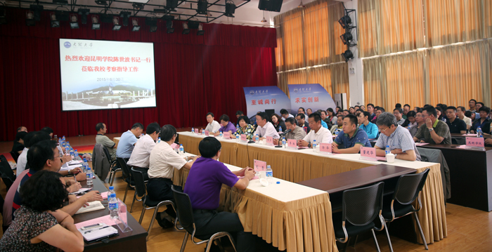 6月30日上午,在返昆途中,学校党委陈世波书记一行到大理大学进行了考察交流。大理大学党委书记李兴华热情接待了陈世波书记一行。交流座谈会在学生活动中心举行。大理大学党委副书记段林、纪委书记杨建华、副校长洪世久、刘荣和机关各部门领导参加了座谈会。会上,李兴华介绍了大理大学的办学历史、学科专业建设、留学生教育、就业工作、科学研究、产学研合作、干部工作以及更名大学的经验和做法。陈世波介绍了开云官网的办学思路定位、学科专业发展、教育教学改革、服务地方发展等方面的情况。两校达成了今后要加强交流合作、促进共同发展的一致意见。随后,大家参观了生物科学馆和校园。