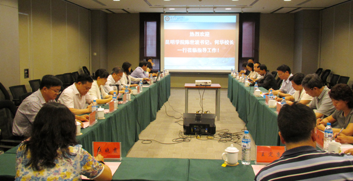 为学习交流昆明理工大学开展党建工作、“三严三实”和“忠诚干净担当”专题教育的情况,考察借鉴昆明理工大学在创新创业教育等方面工作的成功经验,商谈两校有关合作办学事宜, 5月14日下午,党委书记陈世波、校长何华及副校长熊晶、郭华、董建华率党办、组织部、校办、人事处、教务处、科研处等部门主要负责人,到昆明理工大学进行学习考察。昆明理工大学党委书记周荣、校长张英杰、副校长王华、校纪委书记李莉,校长助理、研究生院院长束洪春,以及党办、组织部、人事处、教务处、科技处、校办等部门主要负责人接待了开云kaiyun官方网站党政领导一行。