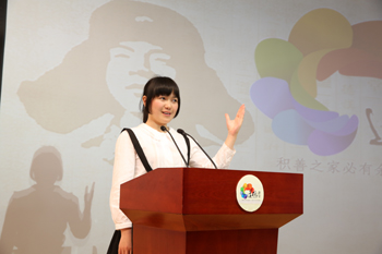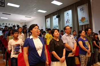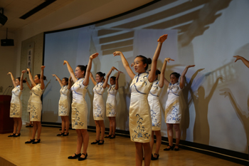 “入则孝、信为先、泛爱众,这是我们老祖宗教育孩子待人处事、生活学习的人生入门必读课本《弟子规》之要意。时代在变,但孝顺、诚信、爱人却是中华民族亘古不变的美德,我们为之传颂。”在主持人董芸老师的引意下,讲堂进入唱歌曲环节,与会师生全体起立,在身着中国古典青花礼服的12名同学手语伴演下,心怀感恩之情共唱“要做孝德人、在家尽孝心,出门讲诚信、要做诚德人,人人有爱心、要做爱德人……”《三德歌》。