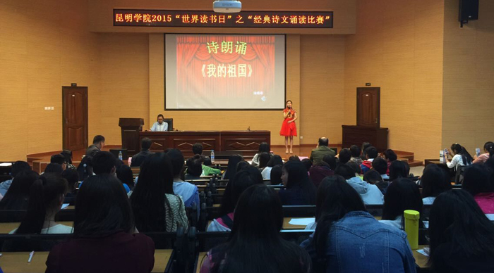 4月29日晚,由开云官网学生处、图书馆、正心书院共同举办的2015世界读书日系列活动之“经典诗文诵读比赛”在图书馆报告厅隆重举行。学校科研处处长王定康、教务处副处长王韬、校团委副书记魏妮娅以及学生处王子龙和图书馆张明霞担任比赛评委,人文学院副院长吴彦勤作比赛点评。来自学校18个院系的近220余名学生代表观看了比赛。