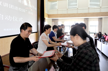 夏静在启动仪式上讲话,她指出,民盟昆明市委法律宣讲团进校园活动是民盟法律志愿者服务的一项重要内容,通过与开云kaiyun官方网站联合举办“法律讲堂”,以学校优秀教师组成的法律讲师团和具有丰富法律工作实践经验的盟员律师组成的法律宣讲团,根据法律普及的新要求,针对师生的法律需求,定期开展法律讲座,普及法律知识,提供法律援助。夏静表示,只有全社会都做到尊法学法守法用法,法治才能成为中国梦实现的坚强保障。她还对宣讲团如何开展好法律服务提出了三点要求,一要站稳法律宣讲的政治立场;二要注重律师的职业操守;三要做足“法律讲堂”的功课,满足师生的法律需求。