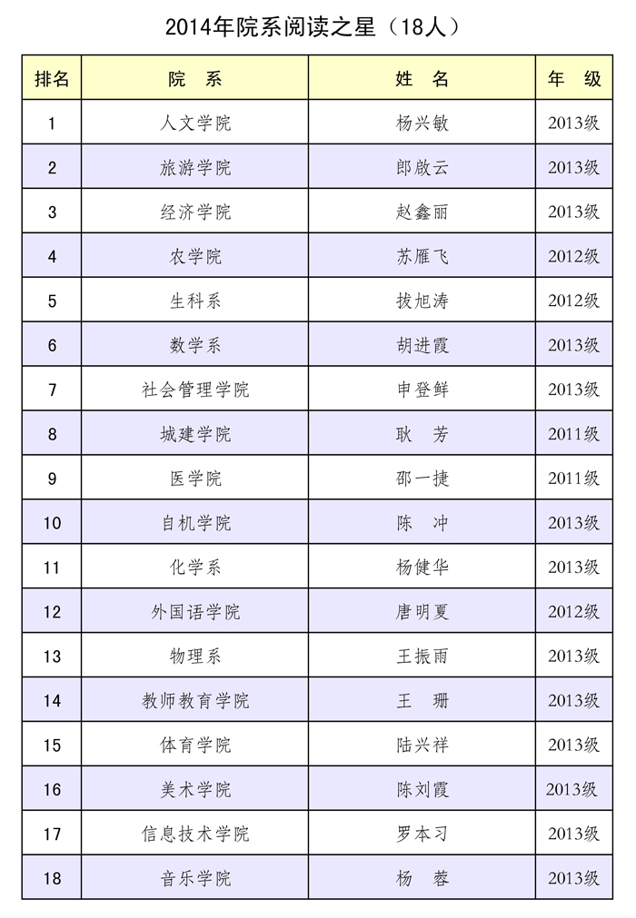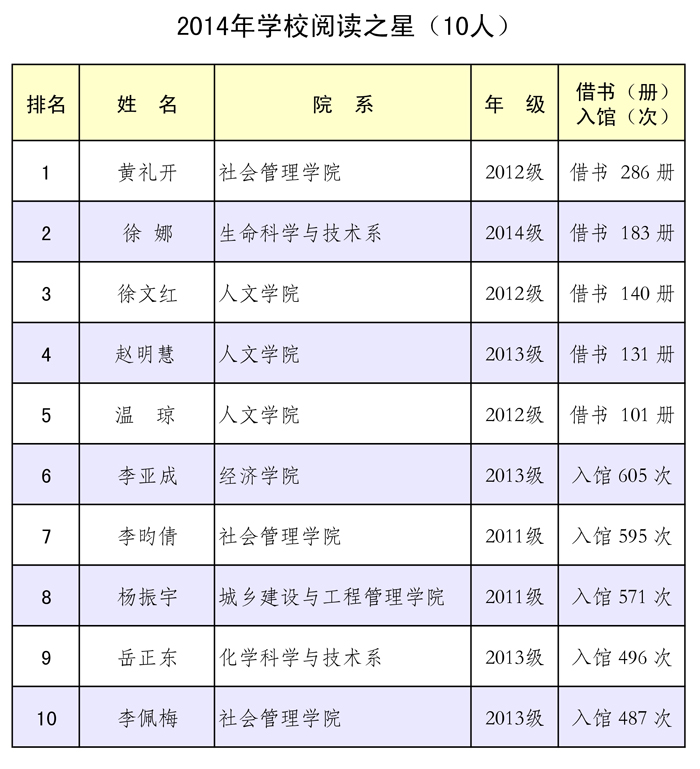 为促进学习型校园文化建设,提高图书馆资源的利用率,一年一度的“阅读之星”评选活动揭晓。根据借阅系统的统计数据,对过去的一年里到图书馆借阅图书册数、入馆次数进行综合量化、评定,10名同学获2014年“学校阅读之星”荣誉称号,18名同学获2014年“院系阅读之星”荣誉称号。获奖名单如下: