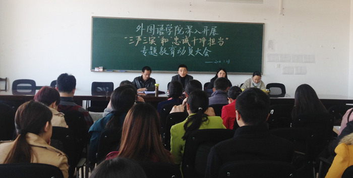 外国语学院党总支把开展“三严三实”和“忠诚干净担当”专题教育活动作为当前一项重大而紧迫的政治任务来抓,思想上高度重视,工作上落实责任,组织上提供保障,确保专题教育活动落到实处、取得实效。第一时间成立了外国语学院专题教育活动领导小组,党总支书记何昊宸为第一责任人,结合学院实际,制定了外国语学院的活动实施方案。在下一步的工作中,外国语学院将统筹推进学校、院系两级专题教育活动,把组织开展专题教育活动与认真做好学院各项工作结合起来,与落实党要管党、全面从严治党责任结合起来,与落实依法治校结合起来,克服畏难思想和倦怠情绪,统筹兼顾、有序推进,努力做到“规定动作不走样,自选动作有特色”。
