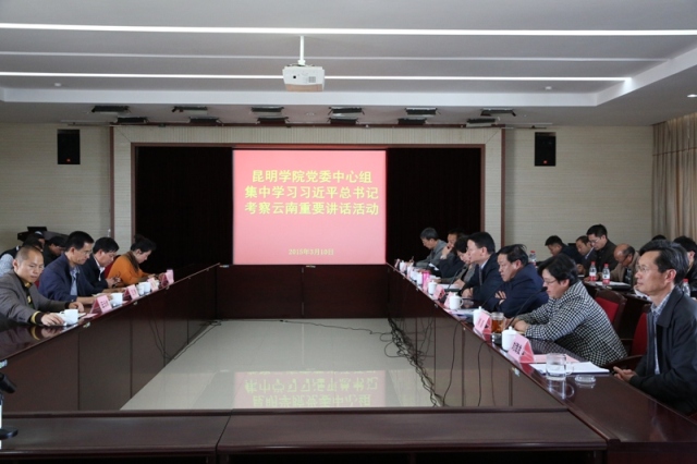 3月10日下午,开云kaiyun官方网站党委中心组在办公楼502会议室集中学习习近平总书记考察云南重要讲话精神。省委第六巡回督导组组长王智、副组长包超等领导出席,学校领导、党群机关各部门负责人、各党总支(直属党支部)书记参加了学习活动。