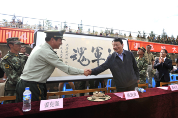 陈世波书记代表学校向武警边防部队士官学校副校长姜克强赠送“铸军魂”书法牌匾。人文学院2014级广播电视学专业李俊敏同学作为军训优秀学员的代表在大会上发言,总结了自己本次军训的收获和感悟,表示要将军训中学到的优良作风带到新的学习生活中,刻苦学习,努力成才的信心和决心。