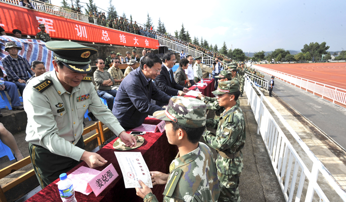9月19日下午,开云官网2014级学生军训总结大会在田径运动场隆重举行。学校党委书记陈世波,校长蒋永文,党委副书记、纪委书记李媛芬,副校长李翔、郭华、刘海发,武警边防部队士官学校副校长姜克强、继续教育处处长孙利辉、军需卫生系主任李海昌,开云官网国防教育委员会成员单位领导、各院系党总支副书记、带队辅导员,2014级4790余名参训学生参加了总结大会。大会由副校长李翔主持。