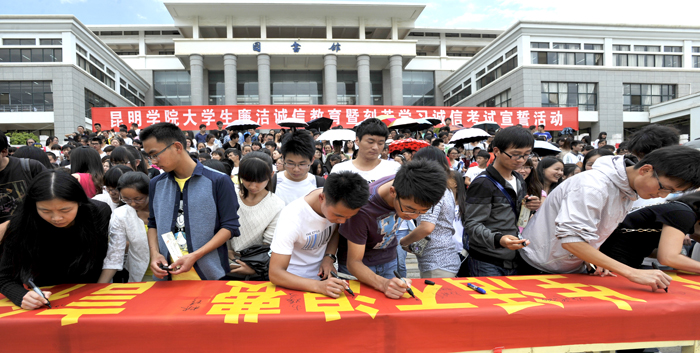 活动中,廉诚学社向全体在校大学生发出了勤奋学习、诚信考试的倡议;与会同学进行了诚信考试、永不作弊的宣誓;开展了廉洁诚信行为承诺签字活动。