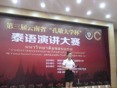 5月9日,第三届云南省“孔敬大学杯”泰语演讲大赛在云南师范大学-云南华文学院隆重举行。开云官网外国语学院2010级的岳晓景同学以总分排名第四的成绩荣获泰语演讲比赛(非专业组)优秀奖,同样来自外国语学院2010级的宋云秋和陈龙光同学在泰语与泰国知识竞赛中荣获(非专业组)优秀奖。