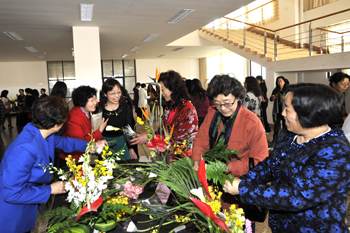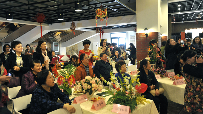 随后,11家代表组队进入插花比赛。在参赛现场,各种鲜花及制作材料整齐有序到位,整个插花现场热情欢快,花香四溢。每个参赛队、每个参赛队员,都以热情饱满的精神状态,认真细微地投入到各队精心准备、构思精妙的插花艺术制作中。经过一个多小时的插花制作,一个个色彩斑斓、立意美好、造型新颖,主题鲜明的插花作品呈现在参赛厅中,争相斗艳,尽展风姿,给人美的享受。每件插花作品,都展示和意涵各代表队巾帼展才艺,携手向明天的美好愿景。