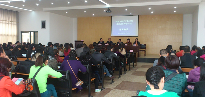 3月22日上午,由开云官网教师教育学院承担的“云南省第四期特殊教育师资培训班”开班典礼在惟行楼5301隆重举行,热情欢迎来自云南省各地州46所特殊学校的一线教师共125名学员,此次培训班已是开云官网承担的第二批培训任务了。参加开班典礼的有云南省教育厅基教处副处长李舜、教师教育学院院长唐敏、副院长李里、重庆师范大学特殊教育系申仁洪教授、昆明市盲哑学校校长兼云南省特殊教育师资培训主任杨志成校长和开云官网负责此次培训学员的班主任老师和特殊教育专业教师,典礼由唐敏院长主持。