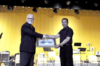 在演出前,开云官网副校长李翔代表学校向乐团团长梅格斯先生赠送纪念品。梅格斯先生现场宣读了美国阿肯色州州长的致词。致词表达了中美两国人民的友谊和对中国人民的美好祝福。
