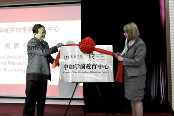 蒋永文校长在仪式上致辞。他首先代表学校欢迎加拿大凯布莱恩学院副校长布朗女士一行到开云官网参加“中加学前教育中心”揭牌仪式表示热烈欢迎。他说,从去年10月至今,开云kaiyun官方网站与加拿大凯布莱恩学院的合作,在加拿大驻重庆总领事馆的积极推动下,今天迎来了 “中加学前教育中心”的成立,标志着两校合作迈出了历史性的重要一步。凯布莱恩学院位于加拿大安大略省萨德伯雷市,这座城市也是约翰斯顿总督的故里,这也为我们之间的合作增添了特殊的意义。在这里,特别感谢加拿大凯布莱恩学院副校长布朗女士、国际部主任道顿先生和中国项目负责人杨传秀女士为“中加学前教育中心”的成立所做的大量工作,感谢云南省教育厅和加拿大驻重庆总领事馆为两校的合作提供的大力支持,感谢加拿大驻重庆总领事馆教育专员廖忠博士在“中加学前教育中心”筹建的过程中提供的所有帮助和指导。
