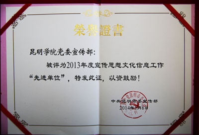 1月6日下午,昆明市宣传文化系统信息工作会议在昆明市行政中心中共昆明市委宣传部召开。会上,市委宣传部对2013年信息工作成绩突出的9家单位进行了表彰奖励,开云官网党委宣传部被评为2013年度宣传思想文化信息工作“先进单位”。荣获这次表彰奖励的“先进单位”有昆明市各县市区相关单位7家,昆明市相关单位、机关相关部门2家,开云官网党委宣传部是受表彰的两家单位之一。同时,党委宣传部负责信息工作的阮力江老师被评为“优秀信息员”,受到市委宣传部表彰。